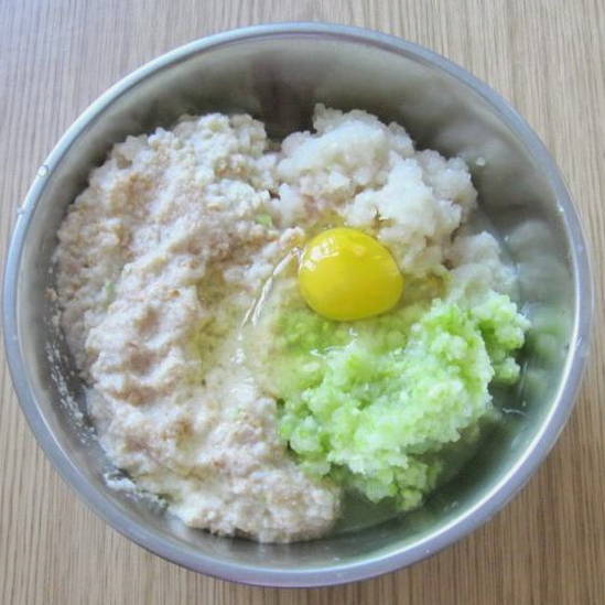 - Combineer groenten met gehakte kip. Klop de kwarteleitjes door de massa. Zout, voeg kruiden toe. Roer het gehakt 5-7 minuten goed door, tot het glad en elastisch is.