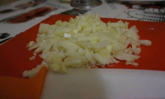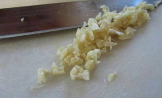 Pel voor de saus de knoflook en hak deze zo fijn mogelijk. Kan door de knoflook worden gehaald. We maken de ui schoon en snijden hem in elke vorm - blokjes, ringen, halve ringen. Drie kaas op een fijne rasp.