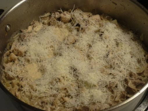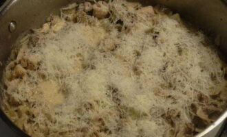 Het blijft om de kaas toe te voegen. We mengen het ook in de saus, zetten het vuur uit en dekken af met een deksel om de kaas te smelten.