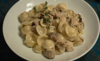 We koken vaak kip en serveren pasta als bijgerecht. Vandaag daarentegen zal pasta het hoofdgerecht zijn, en romige kip- en champignonsaus zullen er een goede aanvulling op zijn. Neem geen zware room, 10% is voldoende. Als er geen andere zijn, kunt u ze verdunnen met water of melk.