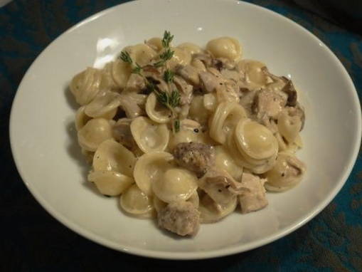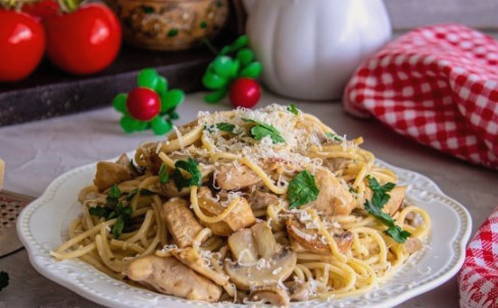 - Pasta met kip en champignons in een romige saus