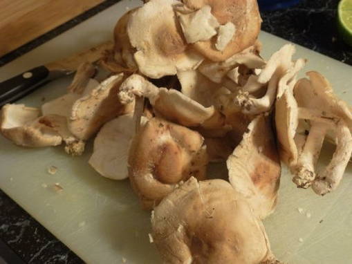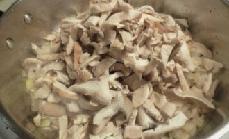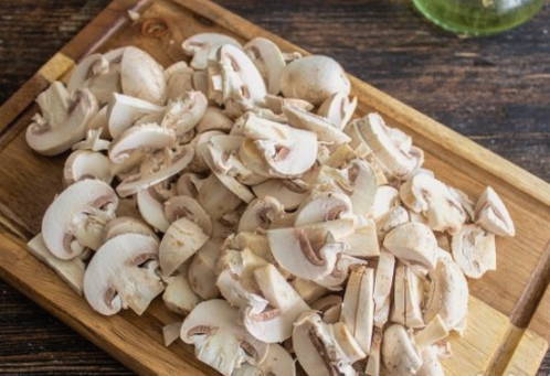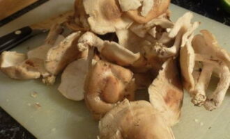 - Gedurende deze tijd snijden we de champignons in dunne platen.