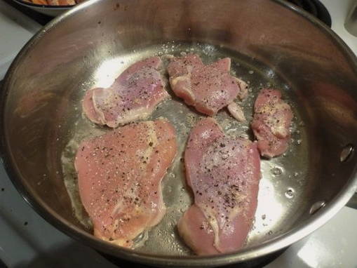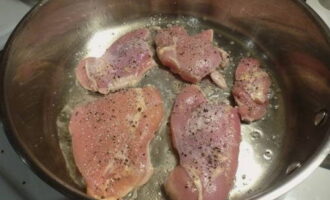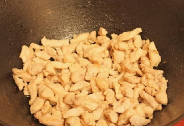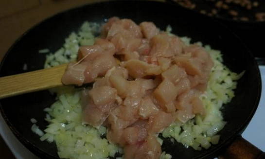 - De kip moet worden gespoeld en gedroogd. Snijd ze in kleine stukjes, zout ze, peper en bak ze een paar minuten op hoog vuur in hete plantaardige olie, onder voortdurend roeren. Het is niet nodig om de hitte tijdens het kookproces te verminderen. Haal de nog halfbakken kip eruit en laat even rusten.