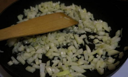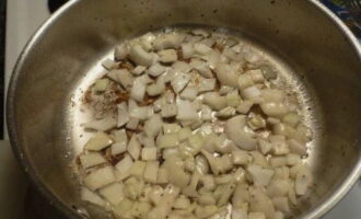 - Verhit een koekenpan op het vuur, voeg plantaardige olie toe en gooi de uien erin. Zodat de ui niet bitter smaakt, bakken we hem niet, maar sauteren hem tot hij transparant is.