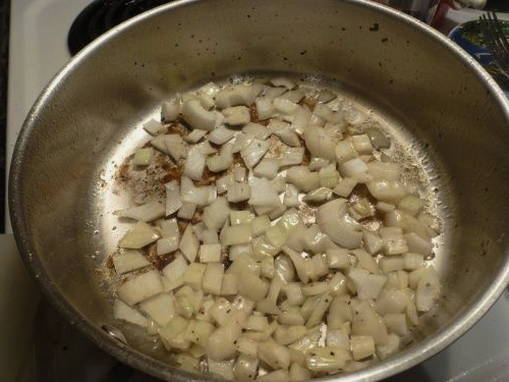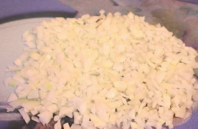 - Als tijdens het kookproces alle vloeistof uit de pan verdampt, voeg dan wat meer boter toe.Pel de ui, hak hem willekeurig fijn en doe hem in de pan.