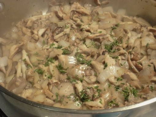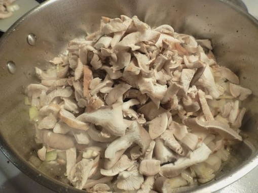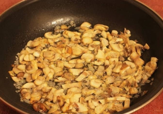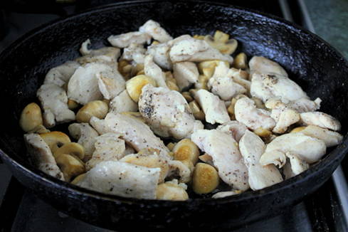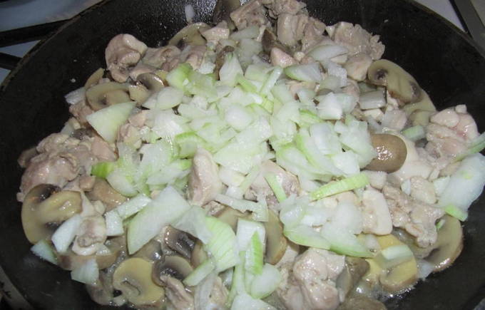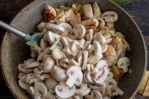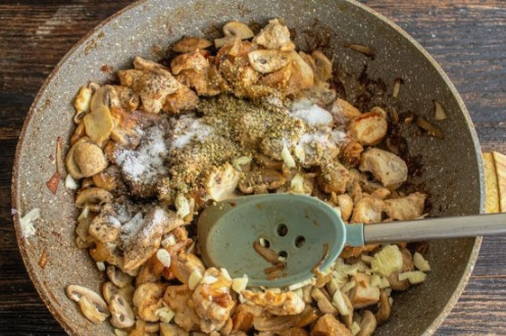 - Doe de kip in een aparte kom en voeg de champignons toe aan de pan. Bak ze lichtbruin en voeg de uien toe. Zout ook alles en kook tot de champignons goudbruin zijn.