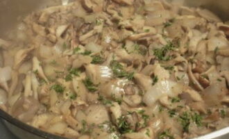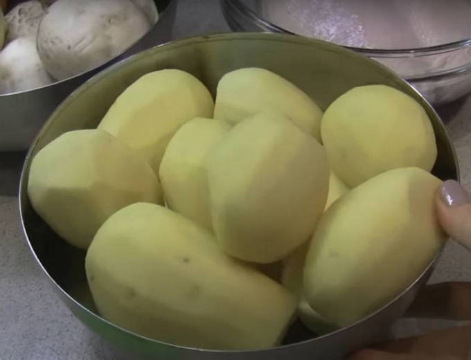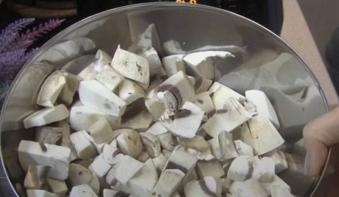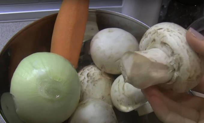 Champignons zijn ook nodig voor de saus. Je kunt zowel champignons als bospaddenstoelen gebruiken. U hoeft er alleen rekening mee te houden dat deze laatste minimaal 40 minuten moet worden schoongemaakt en gekookt. Na een voorbereidende voorbereiding snijden we ze in middelgrote stukken.