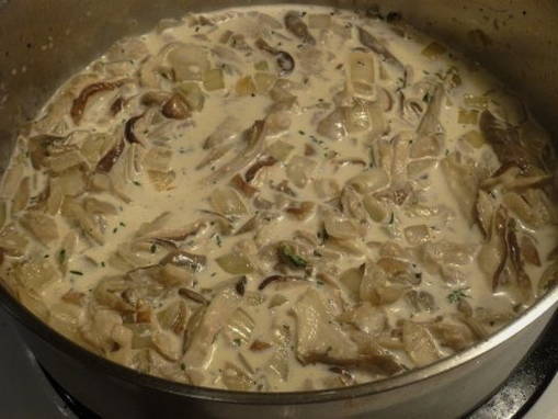 Bak nog 3-4 minuten, vul alles met room, roer en wacht tot de saus kookt.