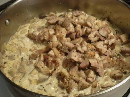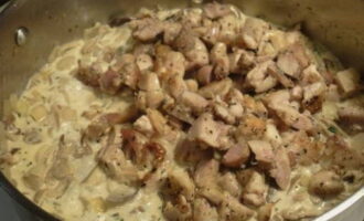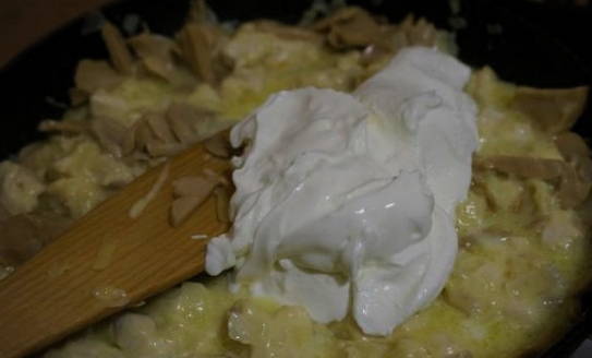 - Het is niet nodig om room te gebruiken om een romige smaak toe te voegen. Je kunt ze vervangen door vette zure room, zoals wij deden. Roer zure room door het resulterende kippenmengsel en laat 10-15 minuten sudderen.