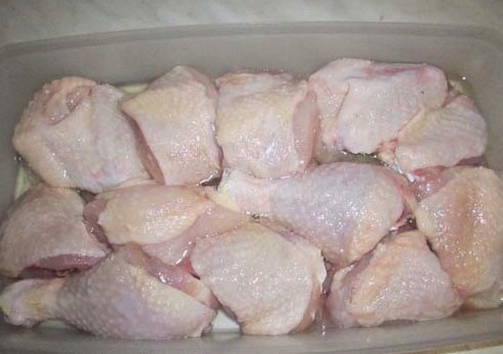 - De kip moet in porties worden gesneden. Je kunt alle onderdelen nemen, maar wij vinden de heupen mooier.Smeer ze in met plantaardige olie.