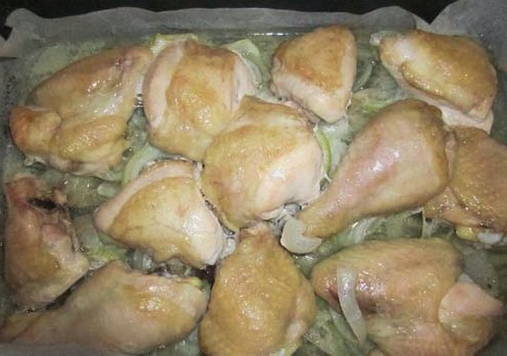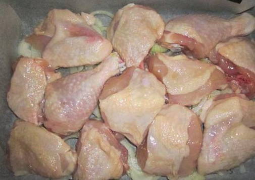 - Schil de ui, snijd in ringen en leg de helft van de resulterende hoeveelheid op een bakplaat bedekt met bakpapier. Leg de kip erop.