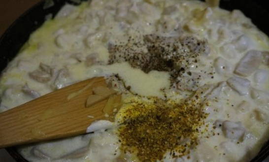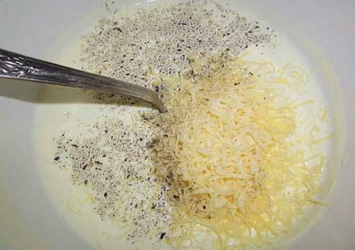 - Laten we verder gaan met het maken van de saus. Meng de room met mayonaise, voeg zout en peper toe en verwarm op laag vuur, niet kokend. Meng de geraspte kaas door de warme saus.