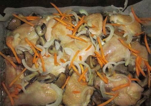 - Snijd de champignons in stukjes en bak ze in plantaardige olie. Snijd de wortel in dunne blokjes en leg deze samen met de champignons op een bakplaat bij de kip. We sturen ook de resterende helft van de boog hierheen.