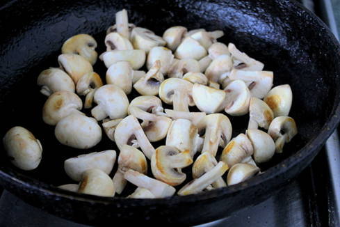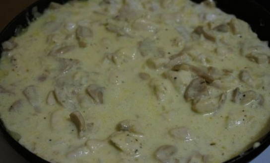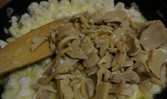 - Leg vervolgens de champignons neer. Meng alles goed.Wij gebruikten ingemaakte champignons. Vers zijn ook geschikt voor dit recept, maar ze moeten apart worden gebakken in een kleine hoeveelheid olie en klaar om over de kip te worden gegooid.