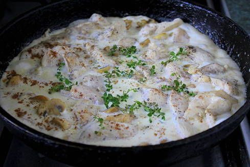 - Kip met champignons in een romige saus in een pan