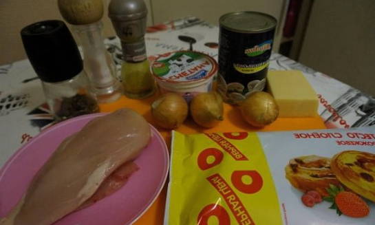 De toch al klassieke combinatie van kip en champignons kan worden gediversifieerd met een interessante presentatie. We verpakken het gerecht in enveloppen van kant-en-klaar bladerdeeg. U hoeft zich geen zorgen te maken over de sappigheid van het gerecht - de saus vermijdt de uitdroging van het afgewerkte gerecht.