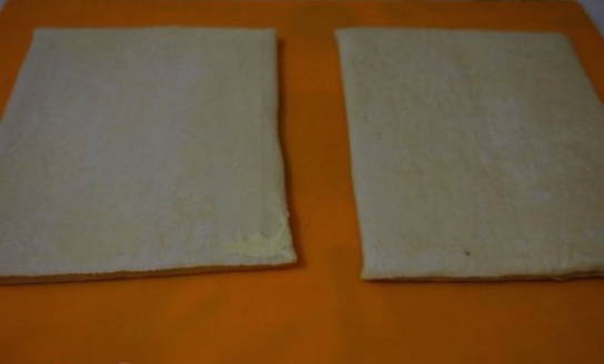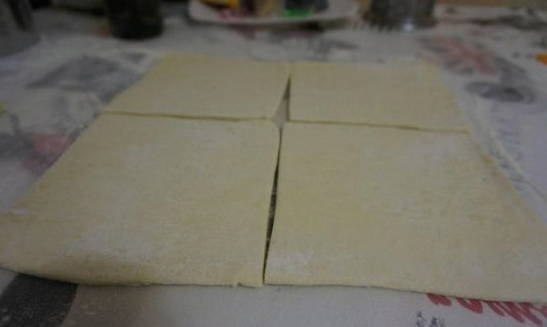 - Rol het deeg uit en verdeel het in 4 delen. Van ons aantal moeten 8 vierkanten worden verkregen.