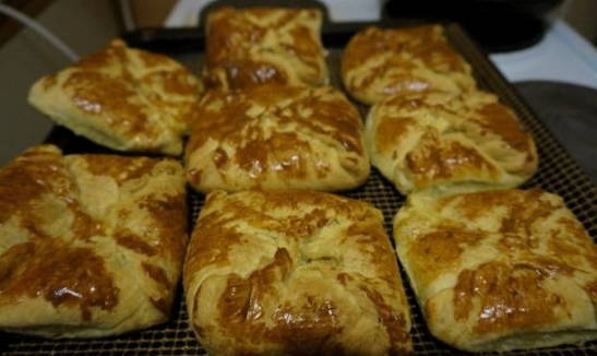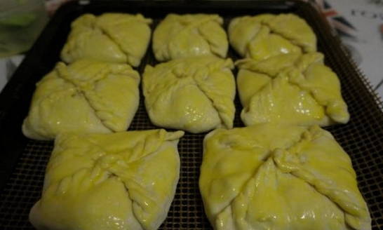 - Bedek de bakplaat met bakpapier en leg de enveloppen erop. Smeer ze in met licht geklopte dooier.