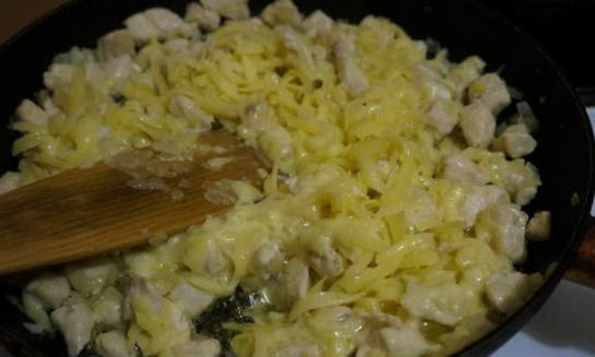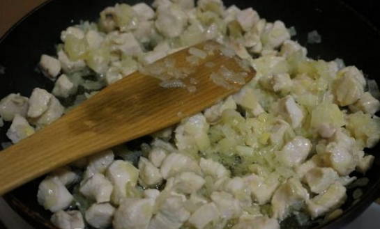 - Zet onmiddellijk water op het vuur om pasta te koken. Als het water kookt, moet je het zouten en de pasta koken tot ze gaar zijn, zoals aangegeven op de verpakking. Ondertussen kookt het water, pel de ui, snij in blokjes en bak goudbruin in olijfolie. Hak de kip fijn en voeg deze toe aan de ui. Bak 2 minuten.