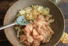 - Snijd de kipfilet in kleine stukjes en voeg toe aan de al transparante ui.