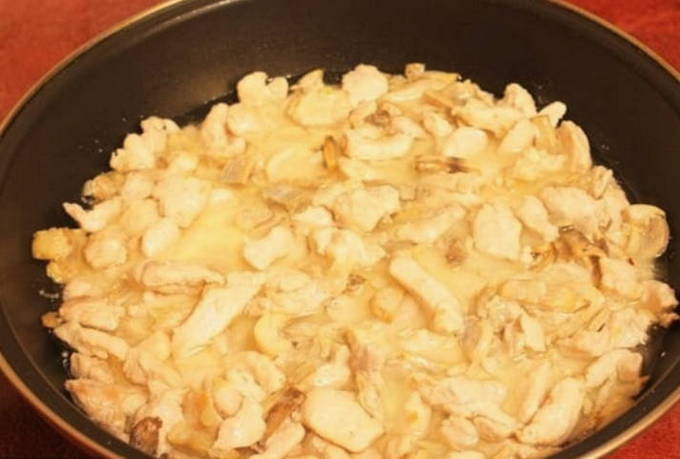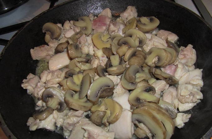 - Snijd de filet in kleine stukjes. Je kunt ook de dijen gebruiken, alleen moeten ze van de botten worden gescheiden. Kook de champignons tegelijkertijd ongeveer 10 minuten.
