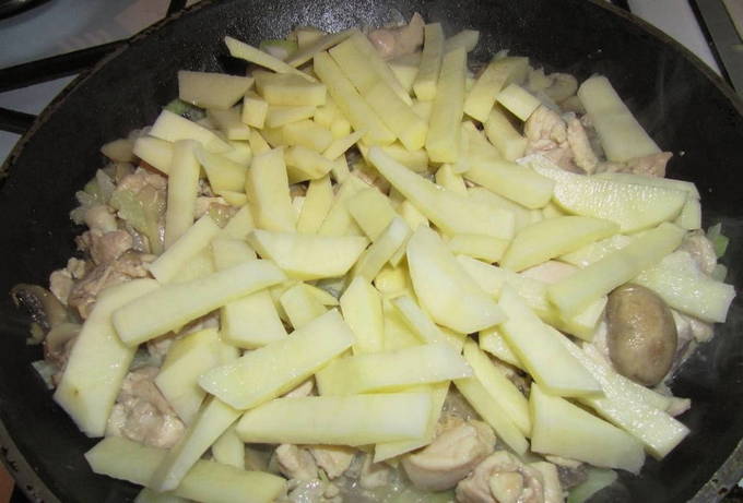 - De champignons moeten ook worden gewassen om vuil te verwijderen en in middelgrote stukken gesneden. Plaats in de pan waar de kip gaar was en bak op dezelfde manier gedurende 2 minuten.