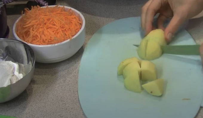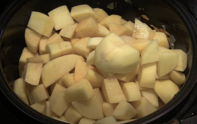 - Snijd de aardappelen terwijl de multicooker aan het opwarmen is. De stukjes moeten groot genoeg zijn.