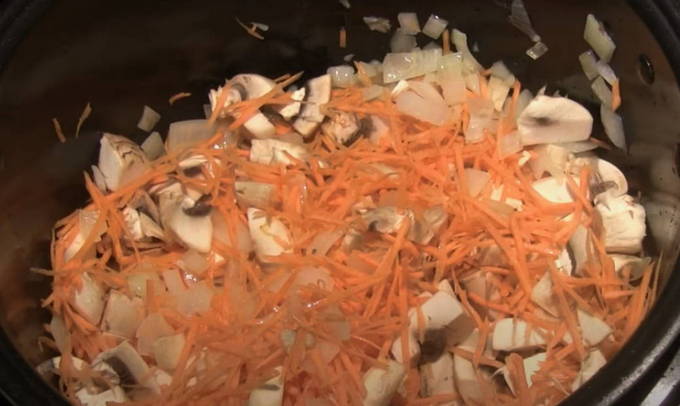 - Wanneer de multicooker een signaal geeft voor verwarming, stuur je de ui erin en laat je deze 2 minuten bakken met het deksel open. Voeg dan de champignons en wortel toe. Roer alles goed door, sluit het deksel en laat het de volgende 5 minuten van de huidige timer met rust.