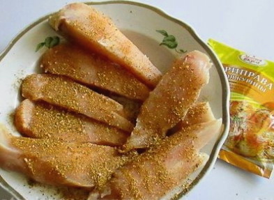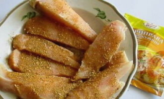 Snijd de kipfilet in dunne lange reepjes. Wrijf ze grondig in met zout en kruiden.