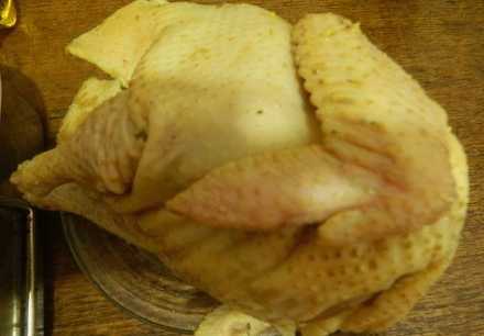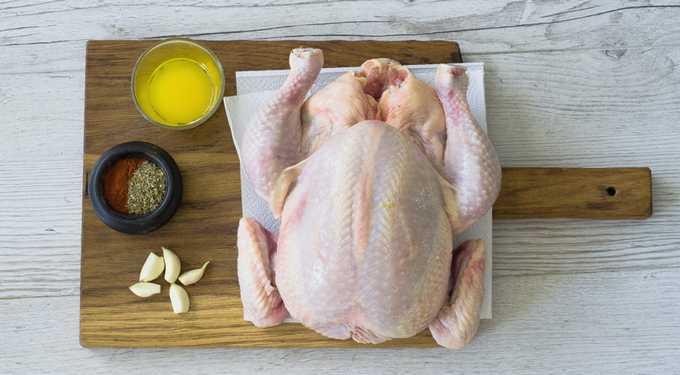 - We wassen de kip grondig onder water van binnen en van buiten. We bereiden de nodige kruiden en schillen de knoflook.