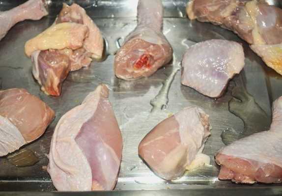 - We verdelen de kip in segmenten, spoelen ze af en leggen ze op een bakplaat bedekt met plantaardige olie.