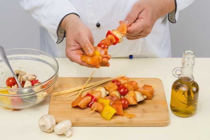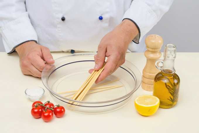 - Voor het koken moeten spiesjes in koud water worden geweekt. Een uur is genoeg.