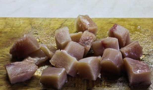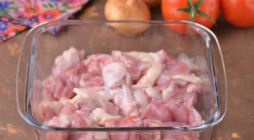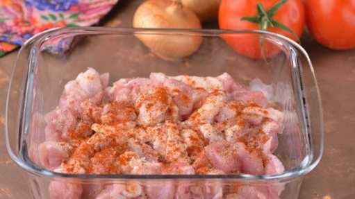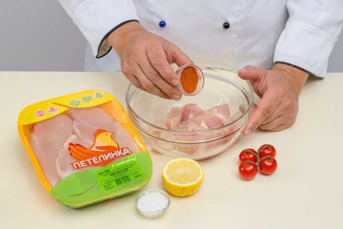 - Snijd de kipfilet in gelijke blokjes. Giet citroensap over het vlees, bestrooi met zout, paprikapoeder en fijngehakt teentje knoflook. Kneed grondig.