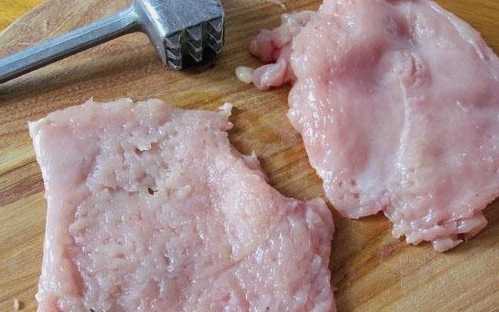 - Snijd de kipfilet in kleine gelijke stukjes. We slaan het vlees eraf met een keukenhamer.