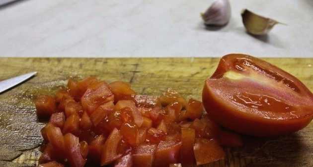 - Verdeel de tomaat in kleine stukjes.