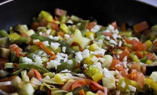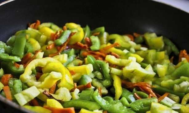 - Snijd de ui en paprika fijn. Bak groenten met spruitjes in plantaardige olie. Zout het gerecht naar smaak en kook het ongeveer 5-7 minuten.
