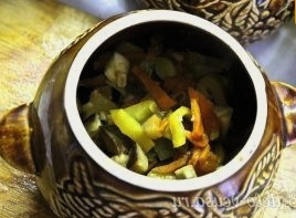 - Leg de groentefrituur op het vlees en zet de potten 30 minuten in de oven. Koken op hoge temperatuur - 200 graden.