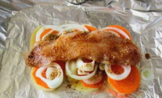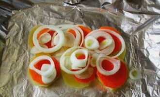 Spreid vier stukken folie uit op een bakplaat. In elk verspreiden we aardappelen, wortelen en uien, in dunne plakjes gesneden.