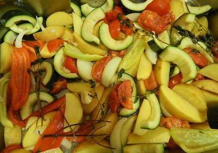 - Snijd vervolgens alle producten in kleine plakjes en leg ze op een bakplaat bedekt met plantaardige olie. Bestrooi de inhoud met zout en tijm.