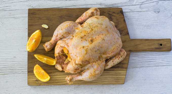- Smeer de kip in met boter, ook de binnenkant. Wrijf het vervolgens in met zout en kruiden.Leg ook sinaasappelschijfjes, halve teentjes knoflook en gehakte greens in de kip.