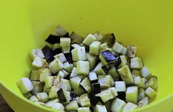 - Snijd de aubergine in de schil in kleine blokjes.