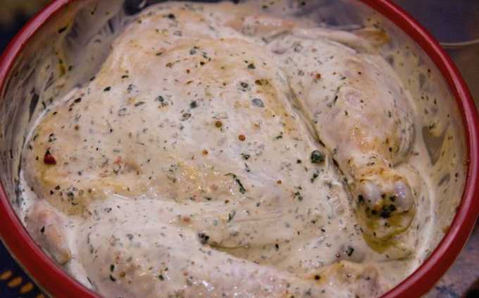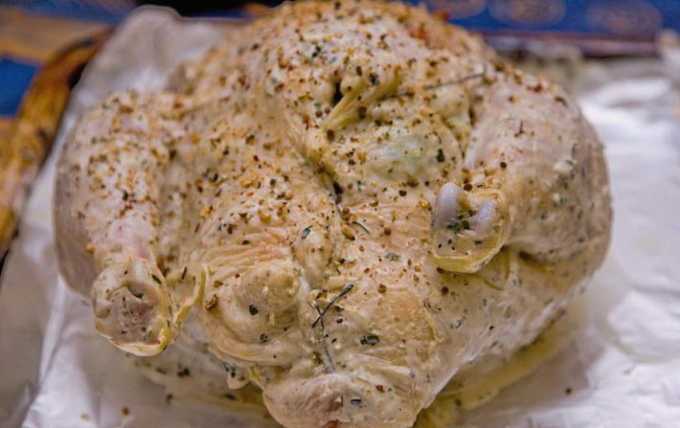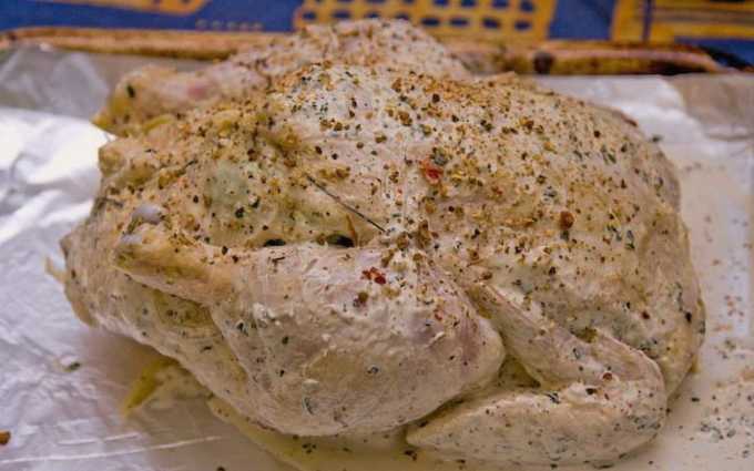 - Spoel de kip grondig van binnen en van buiten en marineer hem in mayonaise met sojasaus, zout en kruiden. We zetten het product 1 uur in de koelkast.