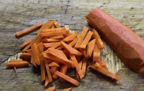 - We maken de wortels schoon en snijden ze in dunne reepjes.