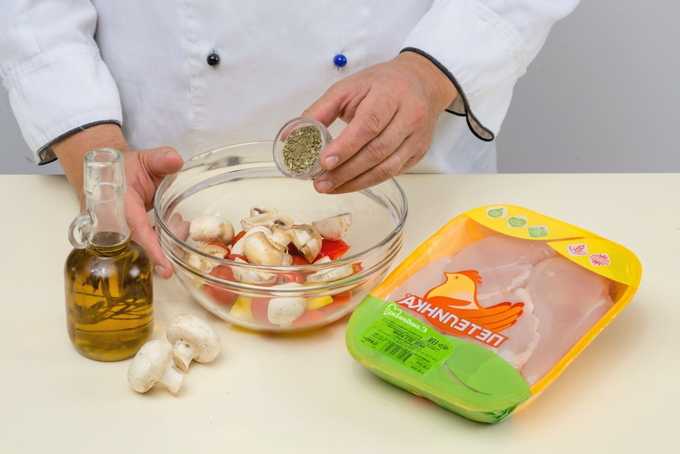 - Voeg gewassen cherrytomaatjes, champignons en gehakte paprika toe aan een bord vlees. Voeg gedroogde basilicum en plantaardige olie toe. Meng het mengsel voorzichtig zodat de ingrediënten niet kreukelen of breken.