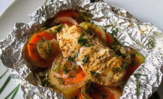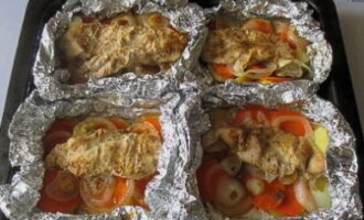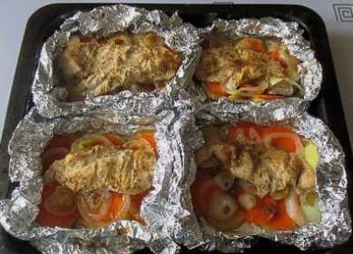 - Sappige kip gebakken met groenten in folie in de oven