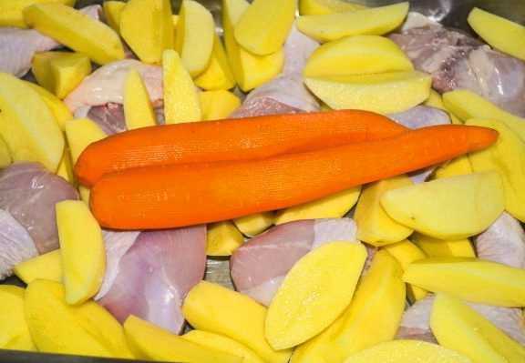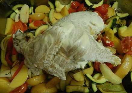 - Snijd de groente in grote plakken en leg ze op de kip.