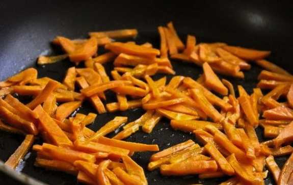 - Bak de wortelen 2-3 minuten in plantaardige olie.