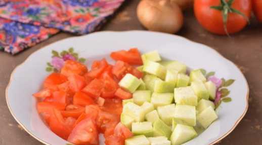 - Snijd de courgette en tomaat apart in middelgrote blokjes.