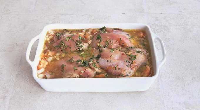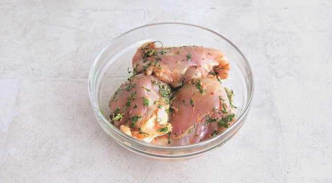 - Was de kippendijen in koud water, wrijf ze in met zout en bestrooi ze met gedroogde peterselie. We geven het vlees een beetje brouwsel.