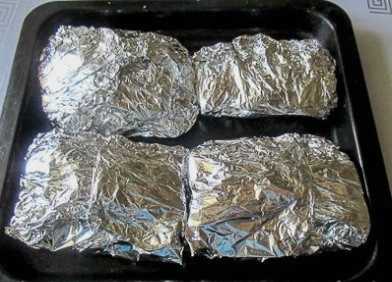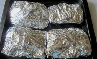 We wikkelen het gerecht in folie en zetten het 50 minuten in de oven. Koken op 180 graden.